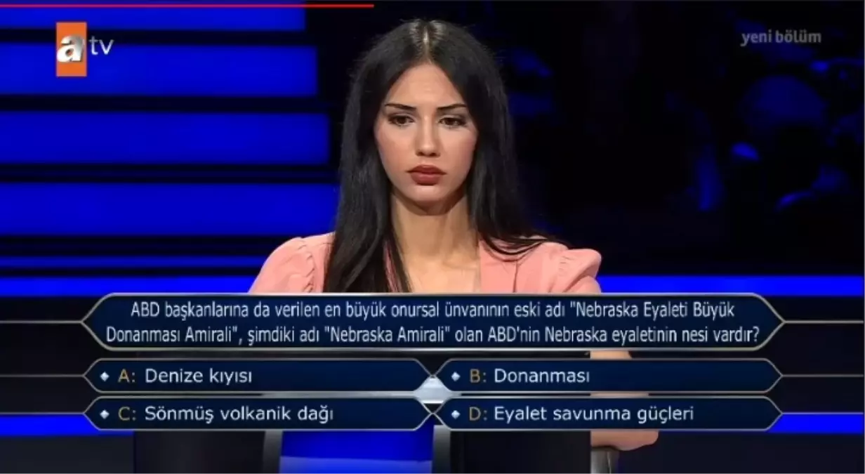 Yeni kısımdaki sorular, ekran karşısındaki izleyicilerde büyük bir merak oluşturuyor. Yarışmacının vereceği reaksiyon ve seçtiği yanıt, izleyenler için büyük bir heyecan ögesi haline geliyor. Tıpkı vakitte izleyiciler de etkin olarak yanıt bulma eforuna giriyor ve bilgiyle eğlenceyi birleştiren bu yarışta kendilerini yarışmacının yerine koyarak tahlil üretmeye çalışıyor. Pekala, ABD liderlerine da verilen en büyük onursal unvanının eski ismi “Nebraska Eyaleti Büyük Donanması Amirali”, şimdiki ismi “Nebraska Amirali” olan ABD’nin Nebraska eyaletinin nesi vardır?