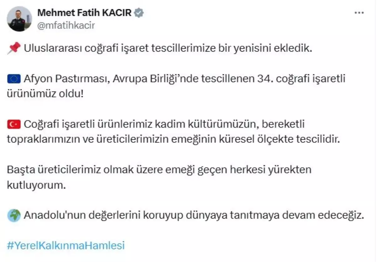 Bakan Mehmet Fatih Kacır, toplumsal medya hesabından yaptığı açıklamada, “Uluslararası coğrafik işaret tescillerimize bir yenisini ekledik. Afyon pastırması, Avrupa Birliği’nde tescillenen 34’üncü coğrafik işaretli eserimiz oldu. Coğrafik işaretli eserlerimiz kadim kültürümüzün, bereketli topraklarımızın ve üreticilerimizin emeğinin global ölçekte tescilidir. Başta üreticilerimiz olmak üzere emeği geçen herkesi yürekten kutluyorum. Anadolu’nun kıymetlerini koruyup dünyaya tanıtmaya devam edeceğiz” dedi.