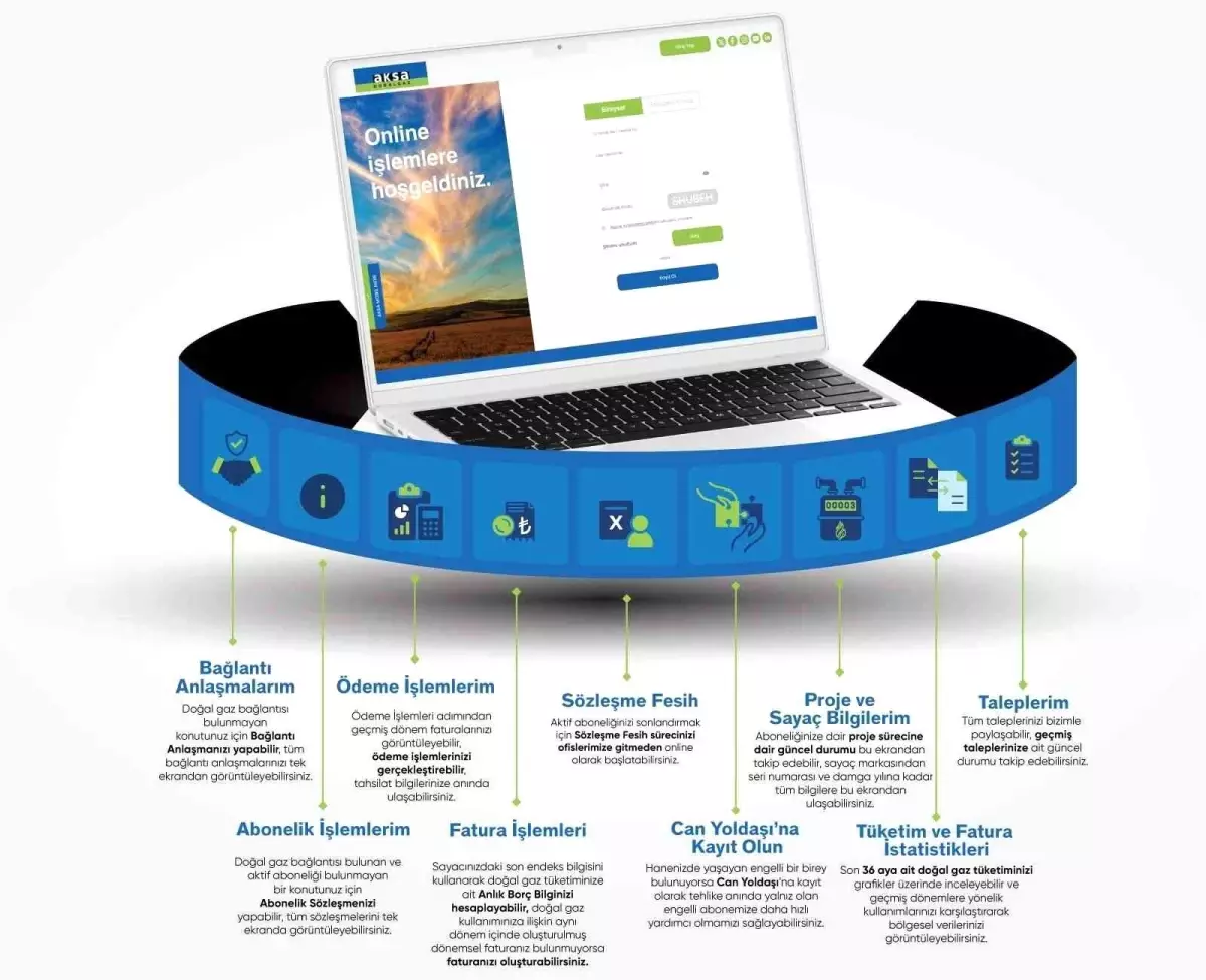 Yapılan açıklamaya nazaran, hizmet verdiği bölgelerde abonelerini doğal gaz konforu ve iktisadı ile buluştururken pak hava alanının oluşumuna katkı sağlayan şirket, hizmet kalitesinde ise en harikası hedefliyor ve daima olarak güzelleştirme çalışmaları gerçekleştiriyor. Şirketin bu bakış açısıyla devreye aldığı yeni Online Süreçler kanalında aboneler artık irtibat mutabakatını ve kullanım mukavelesini oluştururken, geçmiş faturalarını sorgulayıp ödemesini anında yapabiliyor. Aboneler, tüm süreçleri Aksa Doğalgaz ofislerini ziyaret etmeden konutlarının konforunda tamamlayabiliyor.