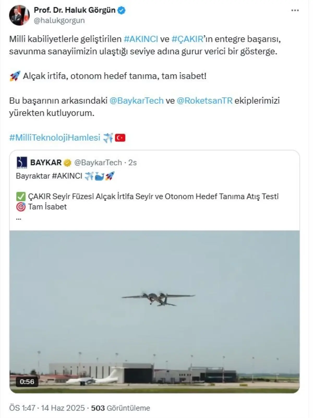 Savunma Sanayii Başkanı Haluk Görgün, Bayraktar AKINCI’nın ÇAKIR seyir füzesi ile gerçekleştirdiği atış testinden manzaraları toplumsal medya hesabından paylaşarak, “Milli kabiliyetlerle geliştirilen AKINCI ve ÇAKIR’ın entegre başarısı, savunma endüstrimizin ulaştığı düzey ismine gurur verici bir gösterge. Alçak irtifa, otonom amaç tanıma, tam isabet. Bu muvaffakiyetin ardındaki Baykar Teknoloji ve Roketsan gruplarımızı yürekten kutluyorum” açıklamasında bulundu.