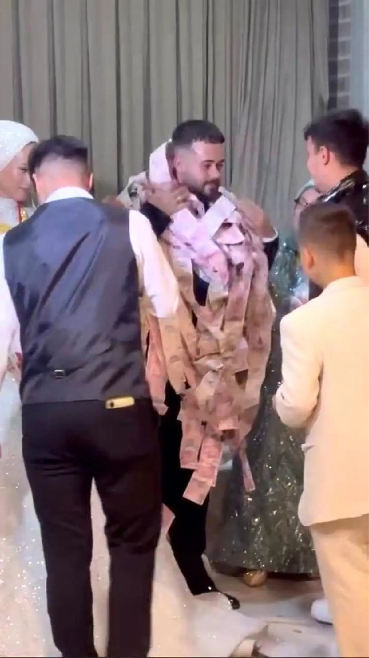 Bursa’da düzenlenen bir düğünde damada bir yakını tarafından metrelerce uzunluğunda para takıldı.