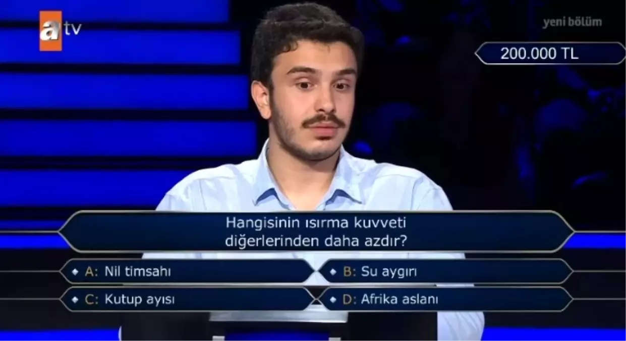 Kim Milyoner Olmak İster müsabakasının yeni kısmında sorulan sorular, izleyicilerin dikkatini çekiyor. Sorunun yanıtını merak eden vatandaşlar, sırf yarışmacının ne karşılık vereceğini değil, tıpkı vakitte gerçek karşılığı da araştırıyor. Eğlenerek öğrenme imkanı sunan yarışta, seyirciler adeta ekran başında yarışmacı üzere düşünüp cevaplamaya çalışıyor. Pekala, Hangisinin ısırma kuvveti başkalarından daha azdır?