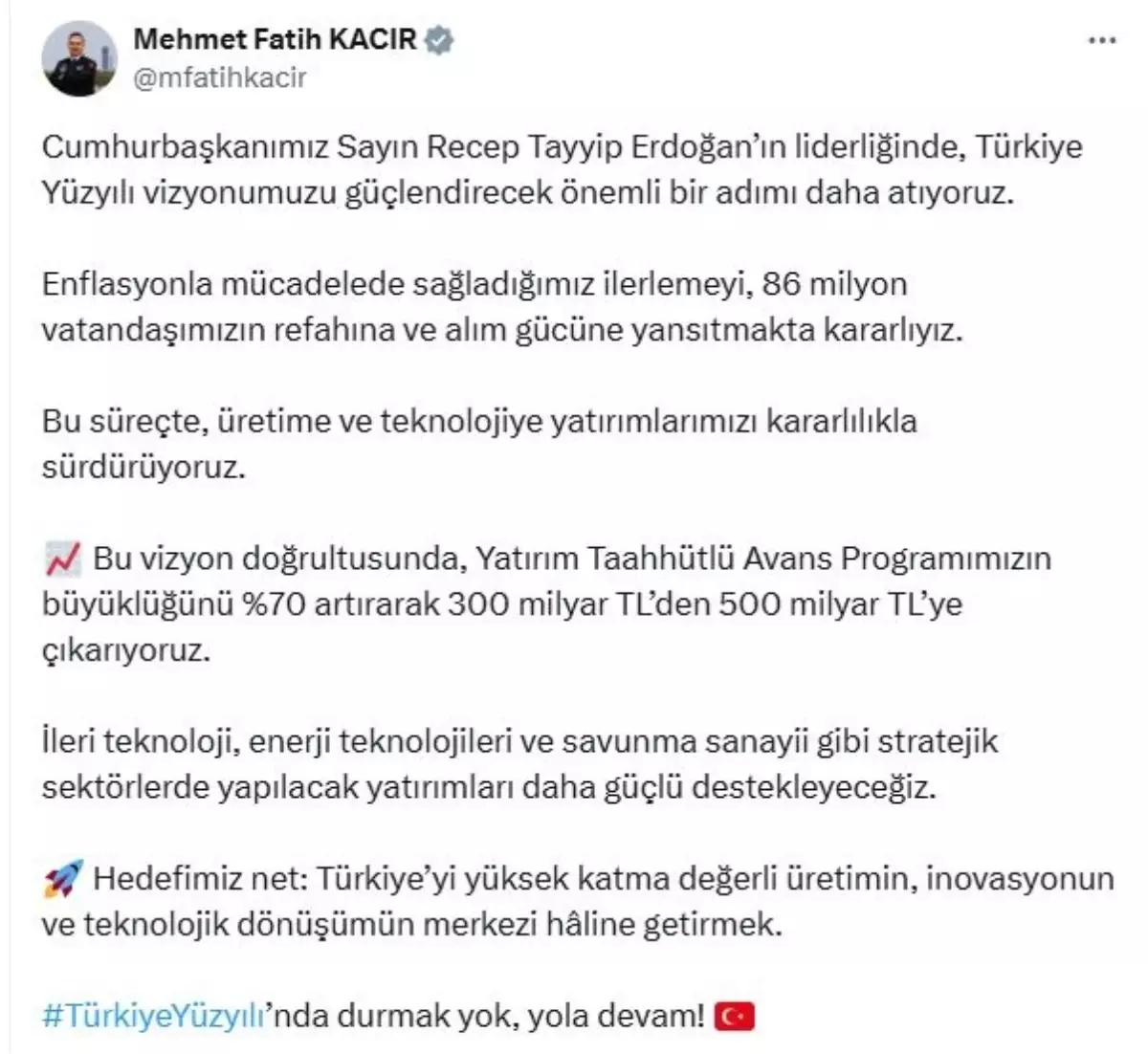 SANAYİ ve Teknoloji Bakanı Mehmet Fatih Kacır, “Yatırım Taahhütlü Avans Programımızın büyüklüğünü yüzde 70 artırarak, 300 milyar TL’den 500 milyar TL’ye çıkarıyoruz” dedi.