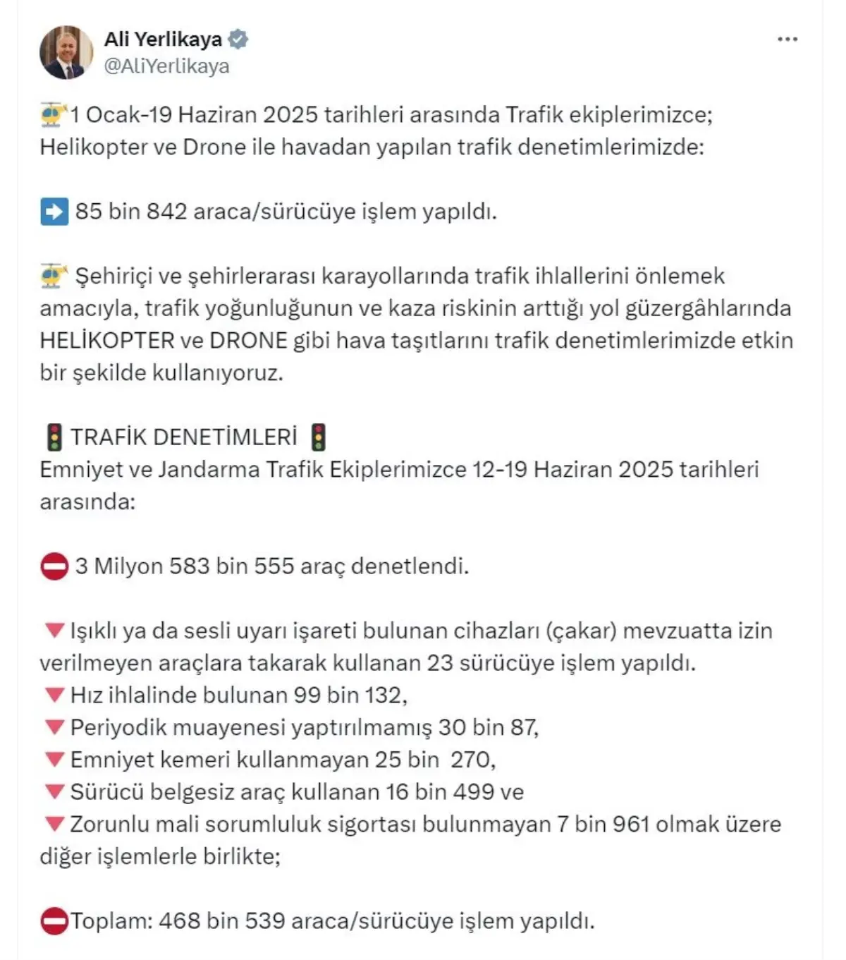 Bakan Yerlikaya, toplumsal medya hesabından yaptığı açıklamada, “1 Ocak-19 Haziran 2025 tarihleri ortasında trafik gruplarımızca; helikopter ve dron ile havadan yapılan trafik kontrollerimizde 85 bin 842 araca/sürücüye süreç yapıldı. Şehiriçi ve şehirlerarası kara yollarında trafik ihlallerini önlemek emeliyle, trafik yoğunluğunun ve kaza riskinin arttığı yol güzergahlarında helikopter ve dron üzere hava taşıtlarını trafik kontrollerimizde aktif bir halde kullanıyoruz” dedi.